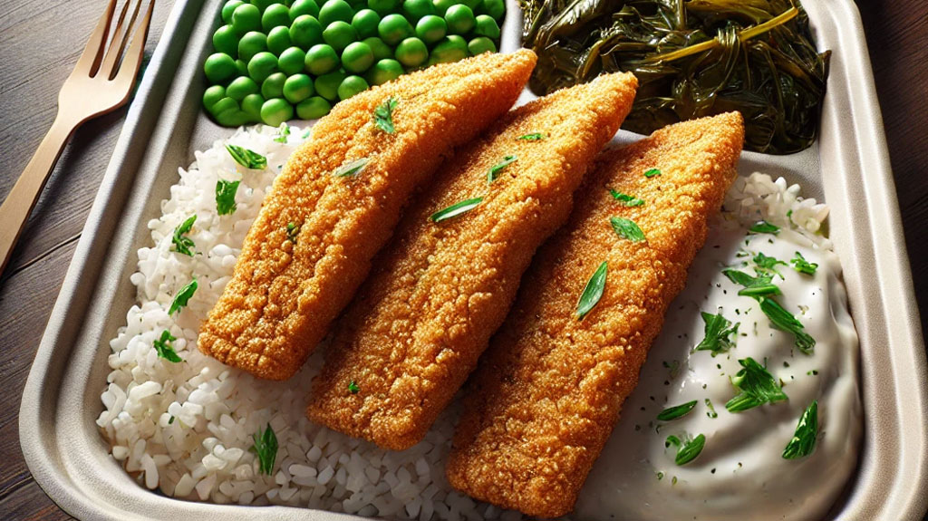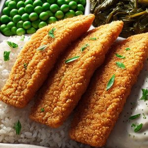 Crispy, bite-sized pieces of seasoned catfish, deep-fried to golden perfection, served with fries